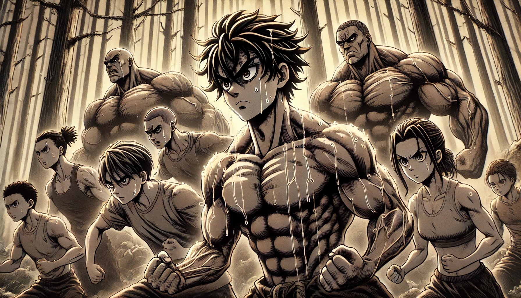 筋肉描写の強化岩柱・悲鳴嶼行冥のもとで行われた過酷な修行(柱稽古)を経た隊士たちの、ビルドアップされた肉体を表現するため。血管や筋肉の陰影がより詳細に描き込まれています。